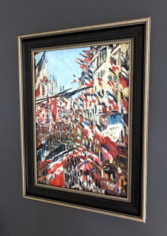 ●作品名:モントルグイユ街-モネ模写 ●作者: -- ●タイプ: 油絵 ●商品サイズ: (額) 横 約40cm x 縦 約50cm (キャンバス) 横 約31cm x 縦 約41cm 額付きです。 本作品の表面にはアクリル板・ガラス板は入っておりません。 取付金具は付属しておりません。